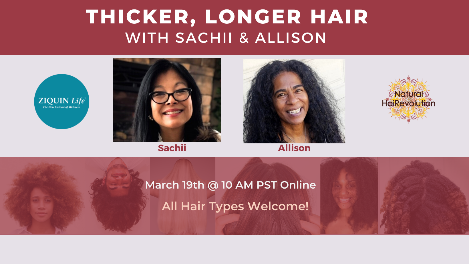 Join Sachii of Ziquin Life and Allison Gibson at Natural HaiRevolution for an informative, engaging discussion about the holistic, natural approach to achieving thicker, longer, healthier hair through nutrition, supplements and herbs… for men and women.